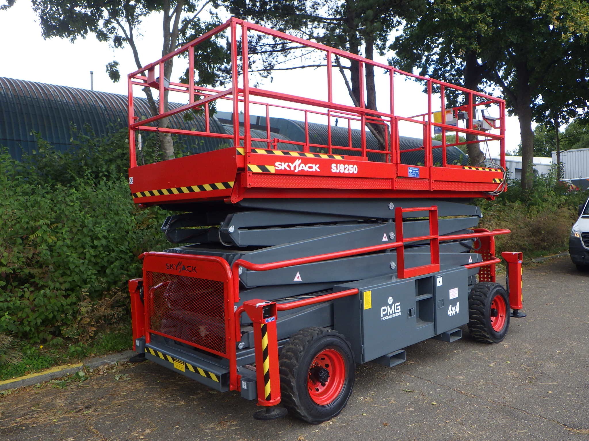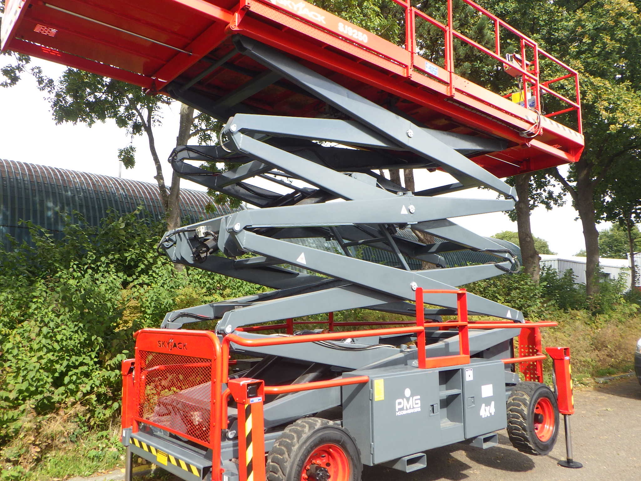 Deze zeer robuuste SkyJack SJ9250 ruw terrein schaarhoogwerker is een in uitstekende staat verkerende machine. Met een werkhoogte van 17 meter en een platformbelasting tot 681 kilogram is de schaarhoogwerker perfect voor de zwaarste klussen. De diesel motor en 4 x 4 aandrijving maakt de SkyJack SJ9250 perfect inzetbaar op de ruwste bouwplaatsen. De stempels maken het mogelijk om ook op zeer ongelijke oppervlakte de maximale hoogte te bereiken. Zoekt u een tweedehands ruw terrein schaarhoogwerker die in een uitstekende staat verkeert, gekeurd is én direct inzetbaar is, dan bent u bij deze SkyJack SJ9250 van PMG Hoogwerkers aan het juiste adres!