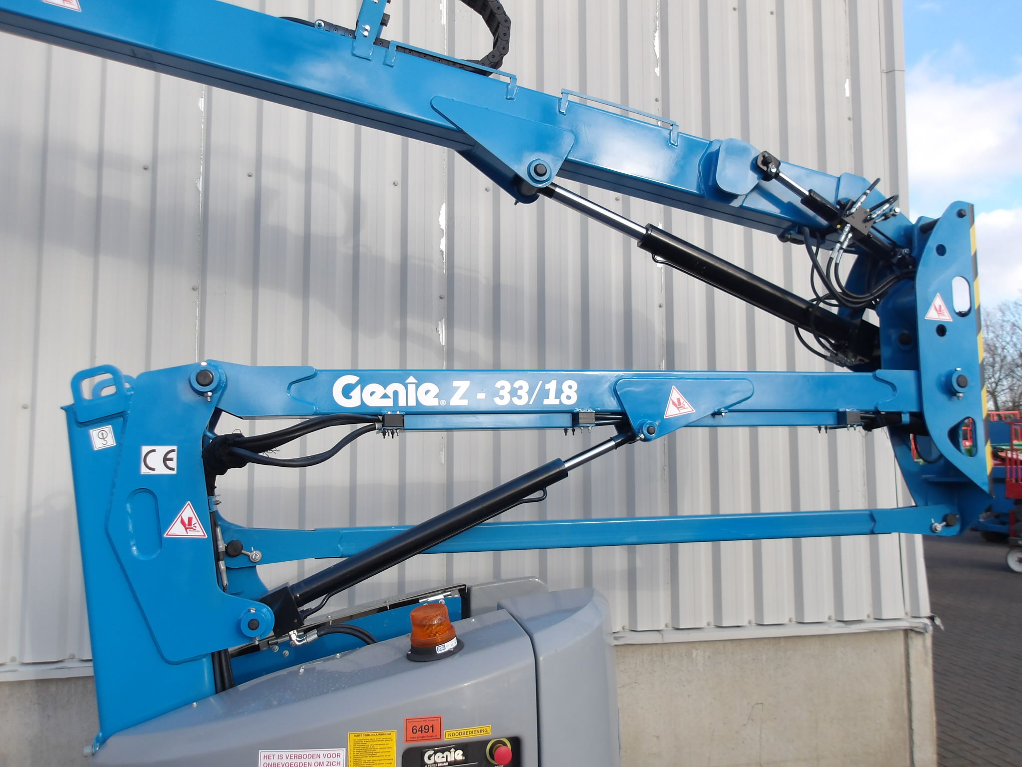 Deze Genie Z-33/18 elektrische kniktelescoop hoogwerker is een in uitstekende staat verkerende machine. Met een werkhoogte van 12 meter en een platformbelasting tot 200 kilogram is deze kniktelescoophoogwerker zeer geschikt om uw productiviteit te verhogen. De beperkte afmetingen, 1,50m x 4,17m, de non-marking banden en een zijdelings bereik van 5,57 meter geeft deze Genie Z-33/18 perfecte eigenschappen voor een zeer uitgebreide range van taken. Zoekt u een tweedehands kniktelescoophoogwerker die in een uitstekende staat verkeert, gekeurd is én direct inzetbaar is, dan bent u bij deze Genie Z-33/18 van PMG Hoogwerkers aan het juiste adres!